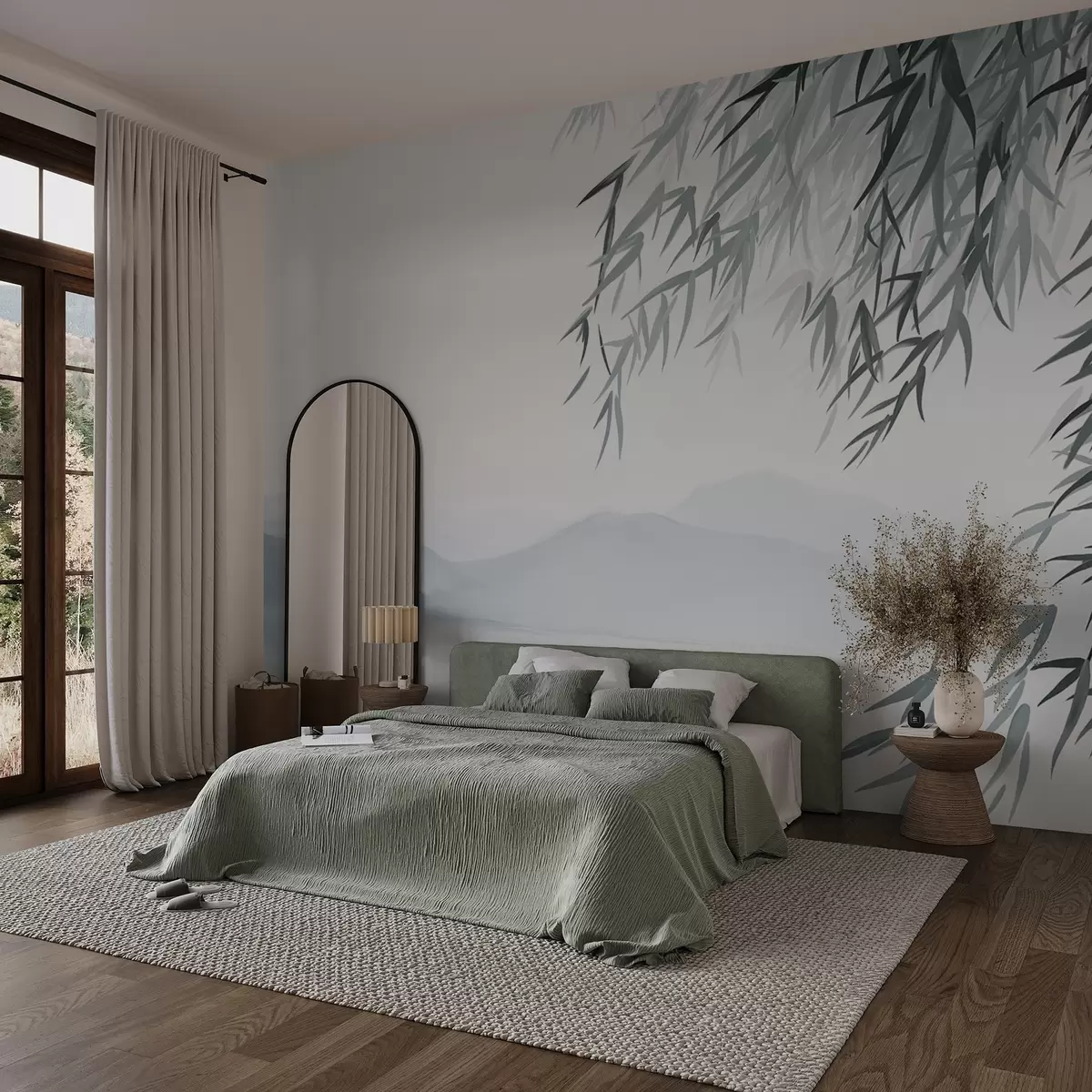 Fototapet Bambusblade, der hænger over en sø med bjerge i baggrunden, bløde blå og hvide toner, tuschmaleristil Nr. w09048