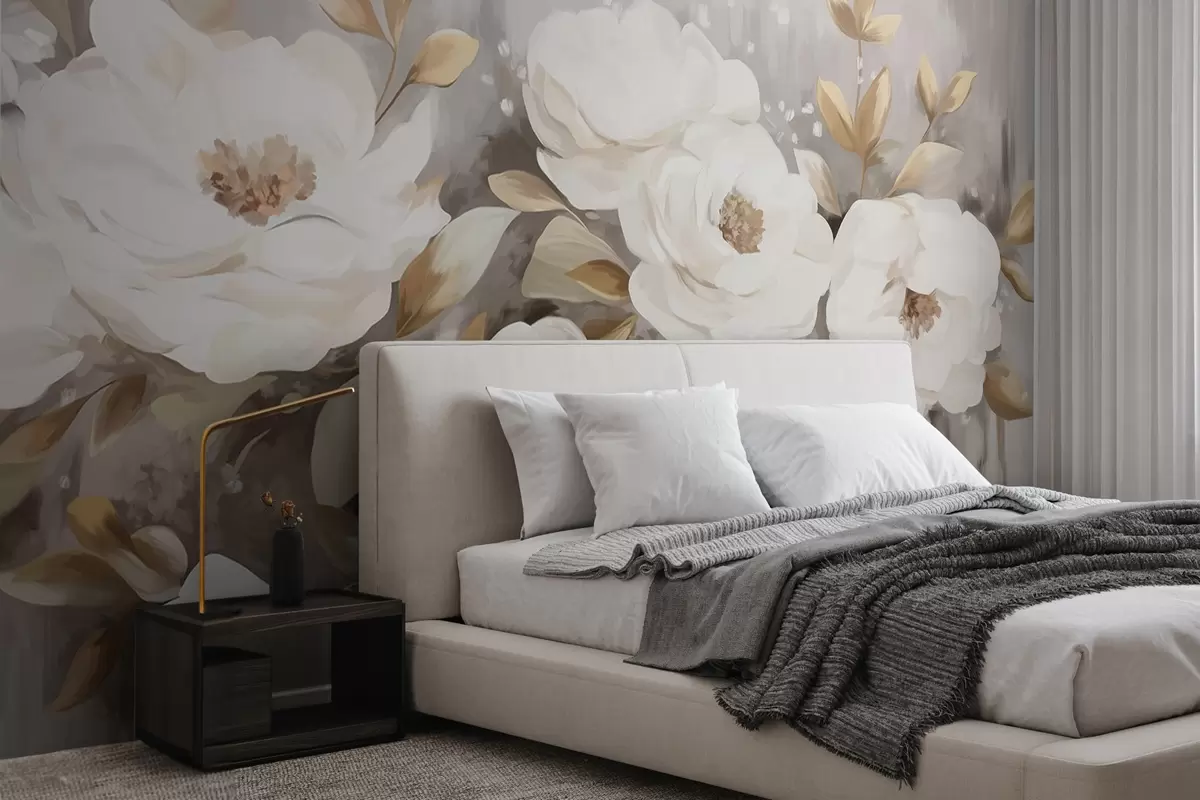 Fototapet Hvide blomster med gule blade, bløde kronblade, delikat blomsterarrangement, neutral farvepalet, strukturerede penselstrøg Nr. w09062