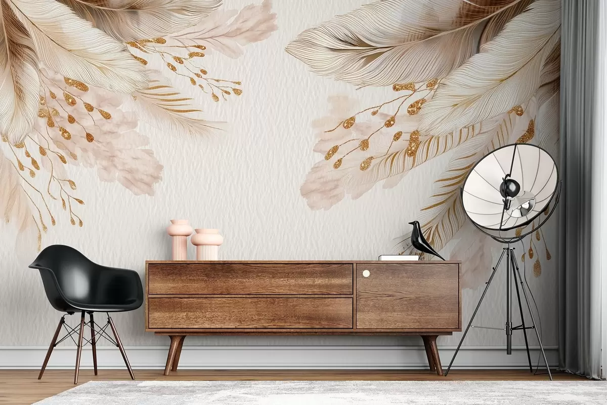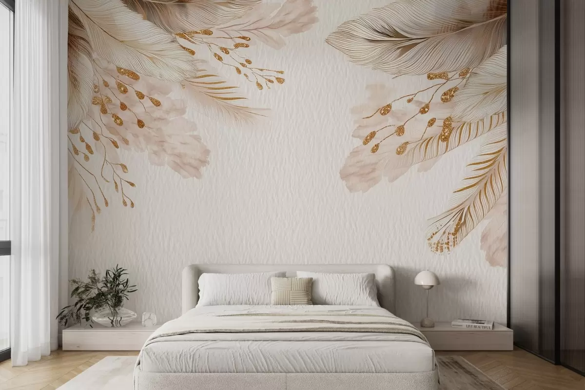 Fototapet Pampasgræs og fjer i akvarelstil i beige og hvid på papir Nr. w09079