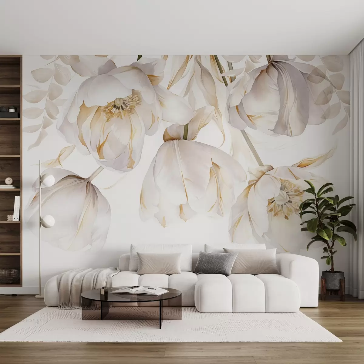 Fototapet Hvide tulipaner med gule pistiller, delikate kronblade, elegant blomsterarrangement, delikat komposition, på en hvid baggrund Nr. w09112
