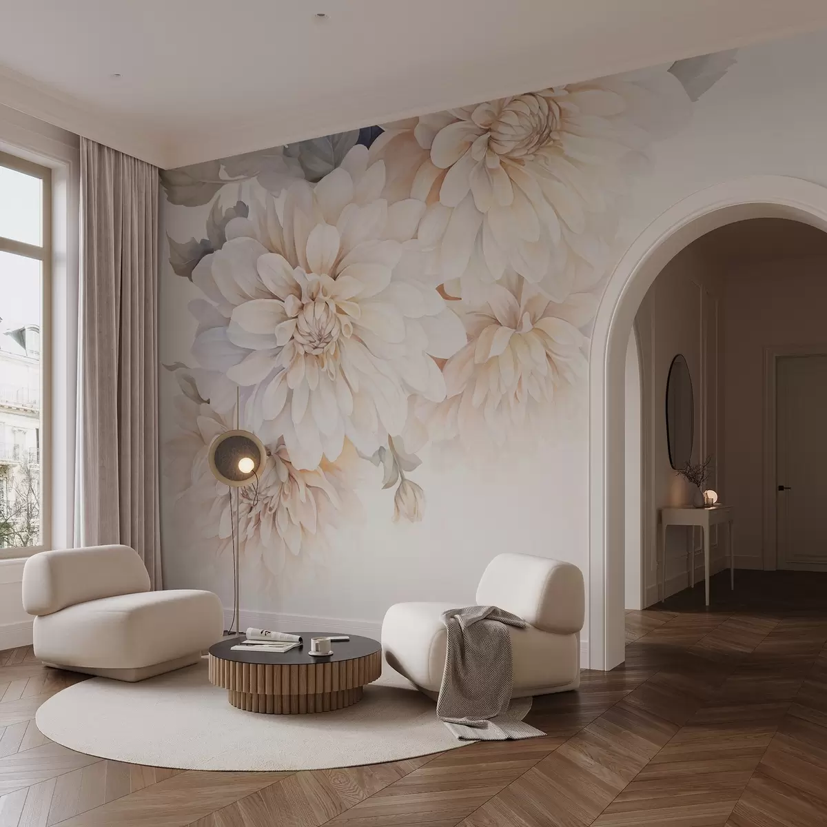 Fototapet Pastelfarvede georginer med bløde, delikate ferskenfarvede og hvide lyse kronblade i akvarelstil, blød baggrund Nr. w09115