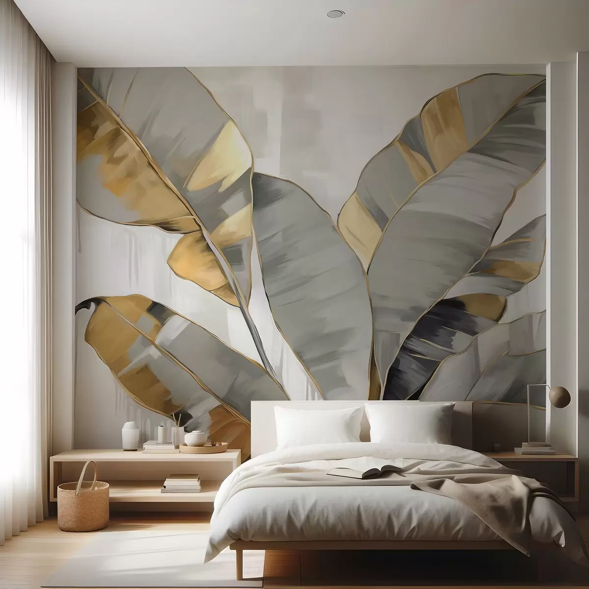 Fototapet Bananblade med tropisk struktur og grå og gule toner, moderne stil, neutral baggrund, dekorativt maleri Nr. w09118