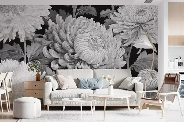 fototapeter Sorte og hvide store orkideer med blade w09125v1