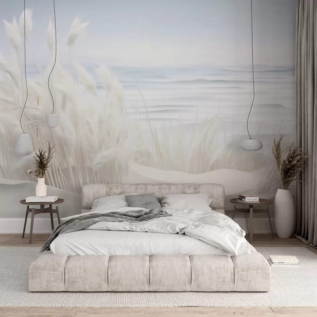Fototapet Landskab med hvidt pampasgræs på en sandklit, med et lyseblåt hav i baggrunden, blød, minimalistisk stil Nr. w09132