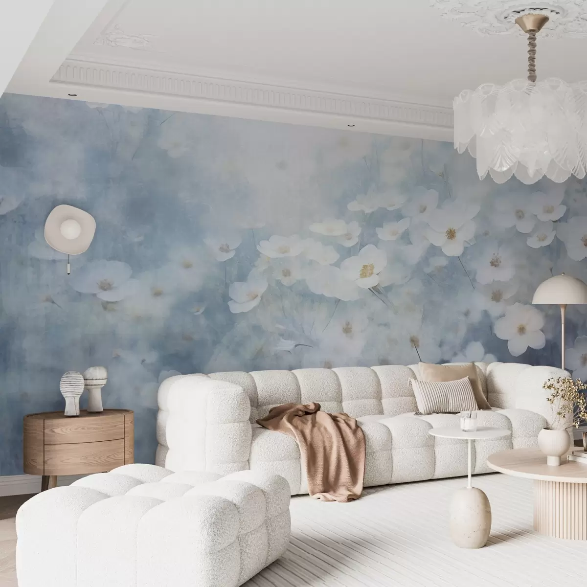 Fototapet Tekstureret felt af hvide anemoneblomster, blødt fokus, drømmende atmosfære, lyseblå og hvid farvepalet, forårseng Nr. w09134