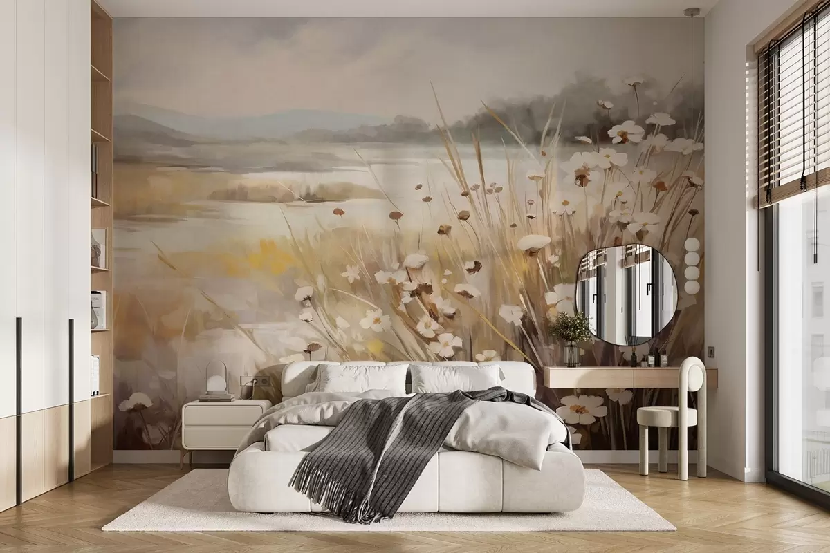 Fototapet Mark med højt græs og hvide margueritter, træer i baggrunden, under en overskyet himmel, tekstureret landskab, bløde penselstrøg Nr. w09139