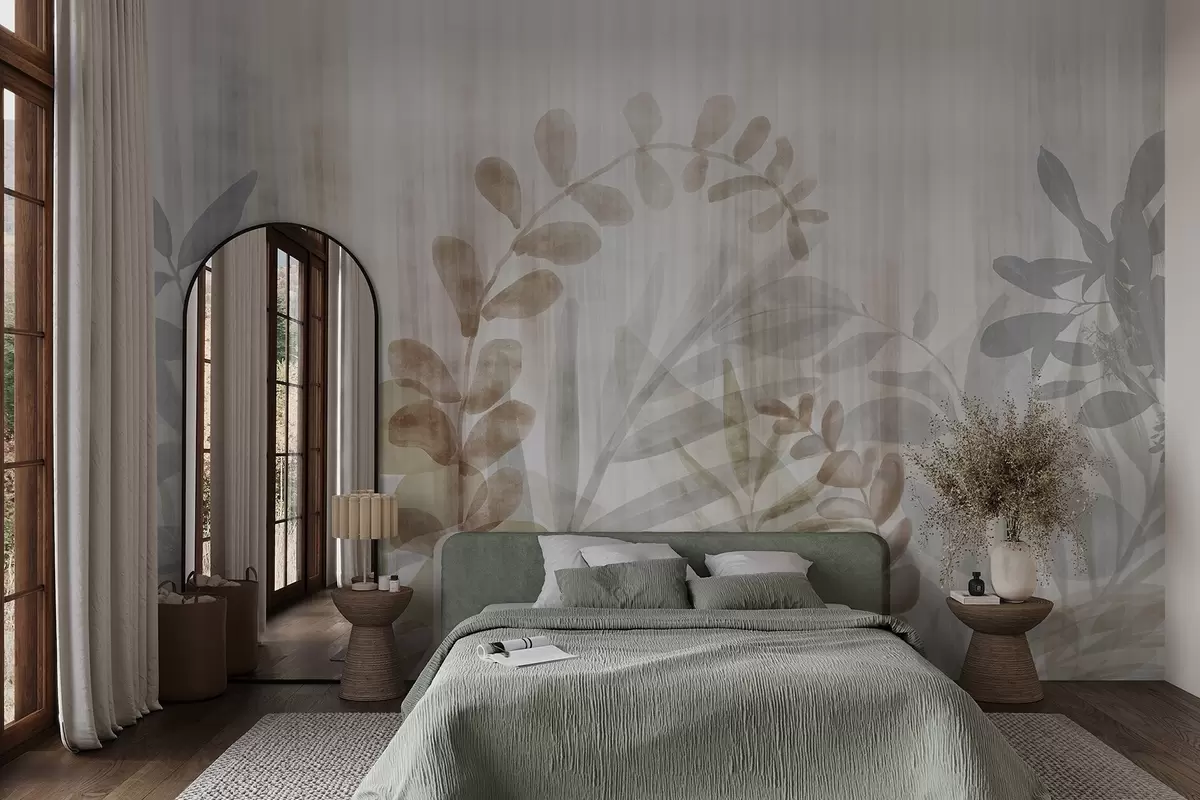 Fototapet Akvarelmaleri med efterligning af planter med flerfarvede, dæmpede blade, lys baggrund med lodrette linjer, botanisk illustration Nr. w09146