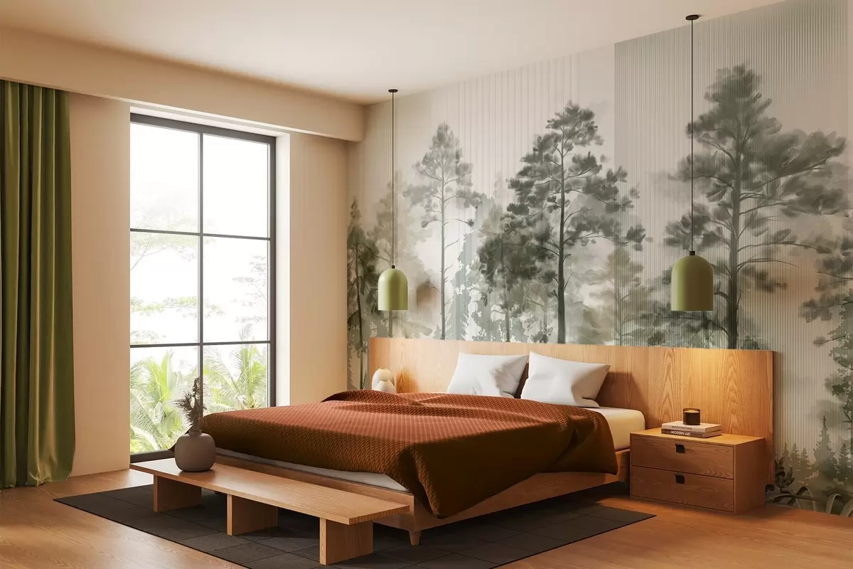 Fototapet En tæt skov med høje fyrretræer, frodigt grønt løv, en tåget atmosfære med lodrette linjestrukturer Nr. w09163