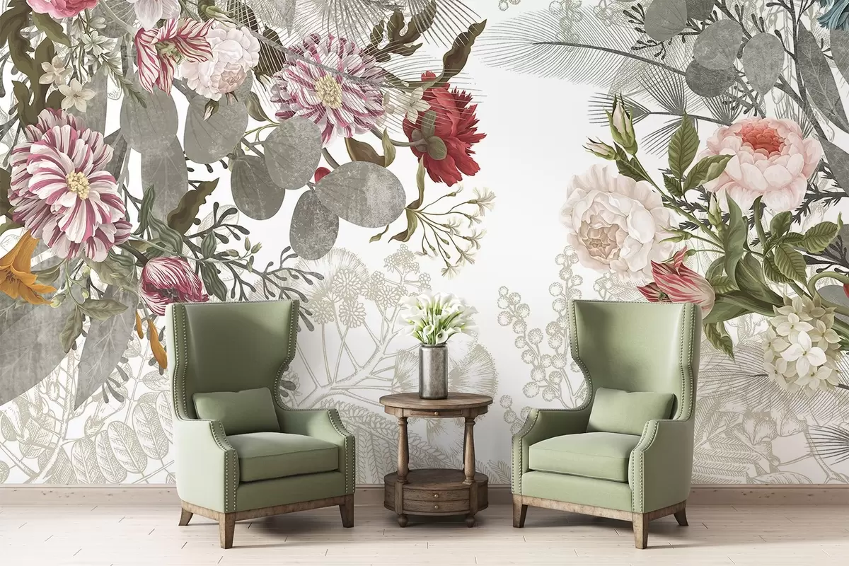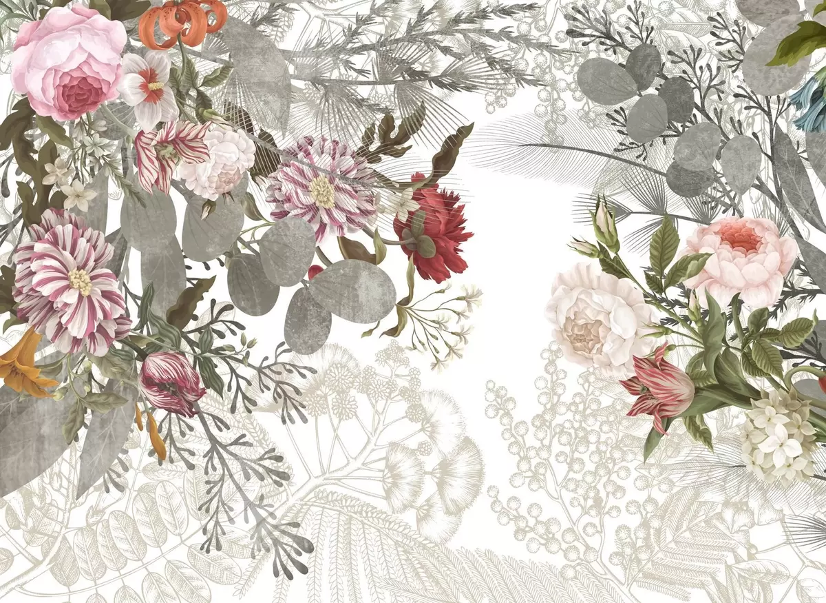 Fototapet Vintage blomsterarrangement med roser, eukalyptus og mimosa i nuancer af dæmpet grøn, rød og pink Nr. w09164v1