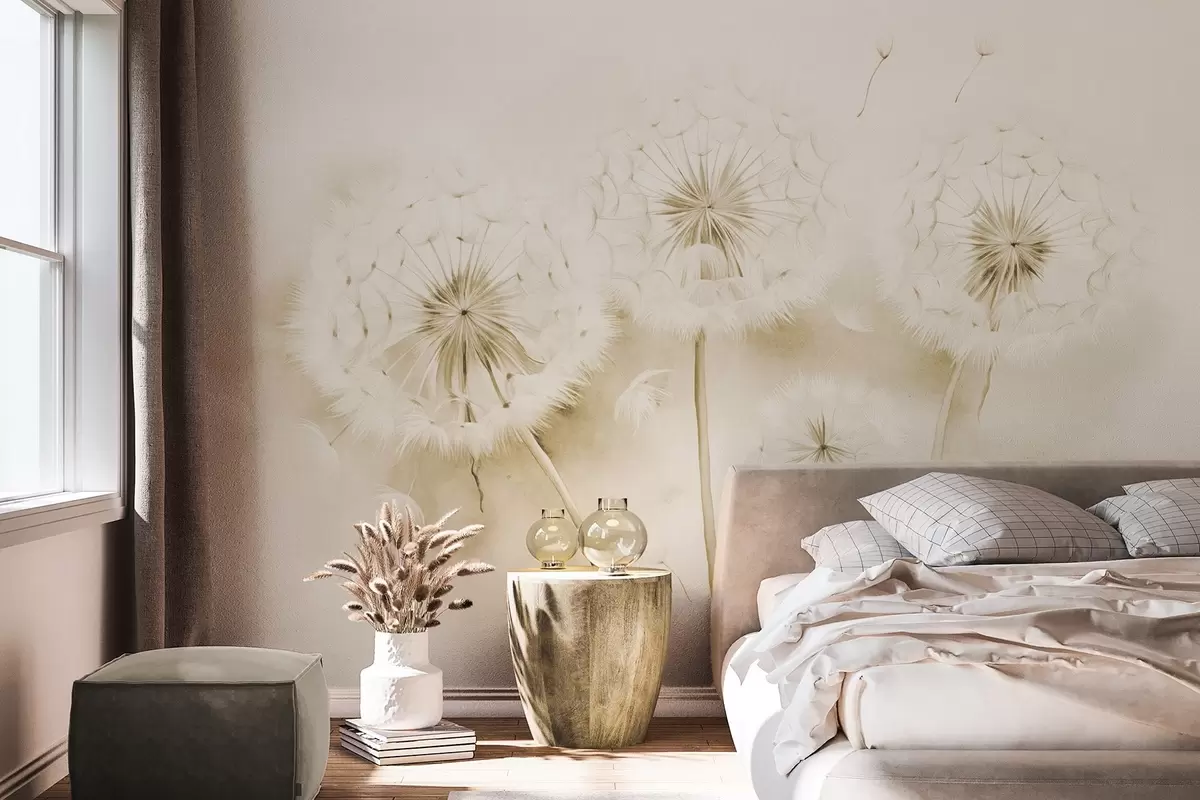 Fototapet Teksturerede mælkebøtter med frø, der svæver i luften, dæmpet gul og hvid baggrund, blød, delikat tegnestil Nr. w09190v1