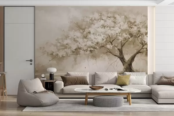 Fototapet Abstrakt beige blomstertræ i fuldt flor, ved siden af en flod, bløde teksturerede penselstrøg og pastelfarver Nr. w09193v1