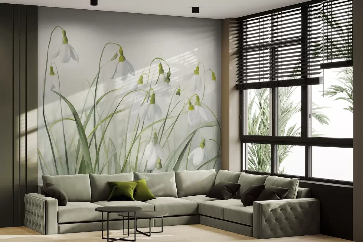 Fototapet Vintergækblomster med grønne strukturerede stængler og blade, akvarel i forårsstil, sarte penselstrøg Nr. w09195