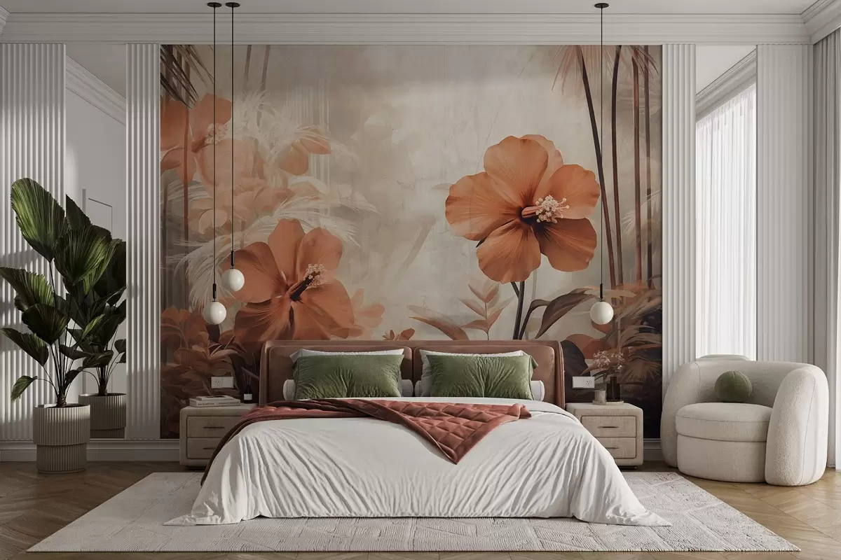 Fototapet Pastelrøde hibiscusblomster med blade og stængler, tropisk vegetation, bløde, dæmpede farver, vintagestil Nr. w09203