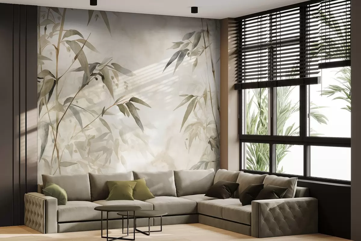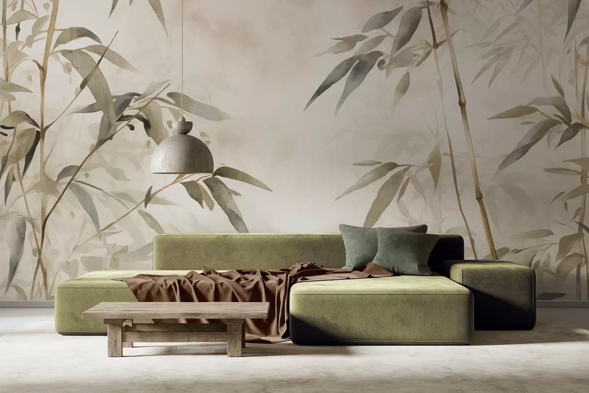 Fototapet Bambusstrukturerede grene med blade i akvarelstil, blød neutral farvepalet, lys beige baggrund Nr. w09204