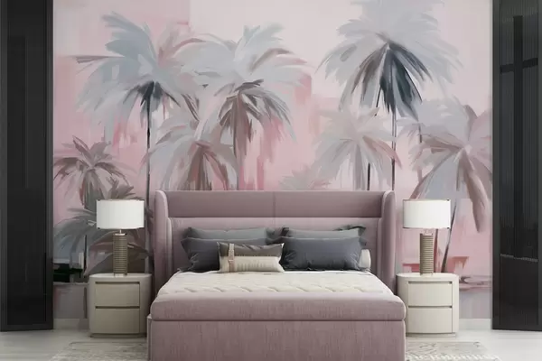 Fototapet Abstrakte minimalistiske pastelfarvede tropiske palmer på en baggrund af dæmpede rosa og grå nuancer Nr. w09212v1