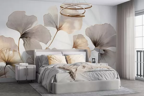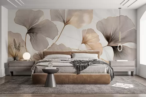 Fototapet Ginkgo biloba-blade i beige, gule og brune toner, delikat struktureret akvareleffekt, lys baggrund Nr. w09215