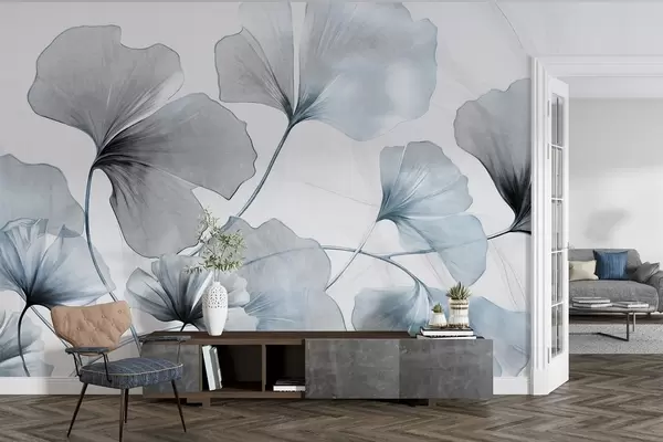 Fototapet Ginkgo biloba-blade i dæmpede blå og grå toner, delikat struktureret akvareleffekt, lys baggrund Nr. w09215v1