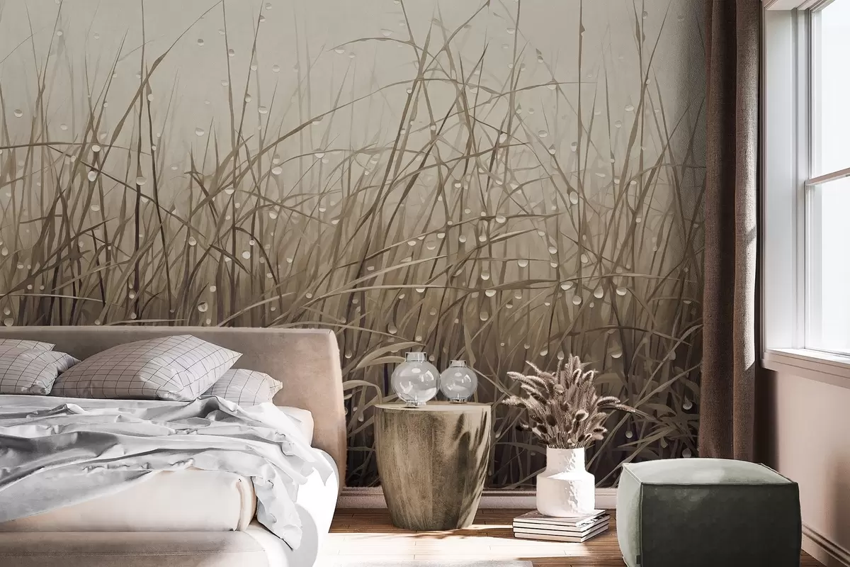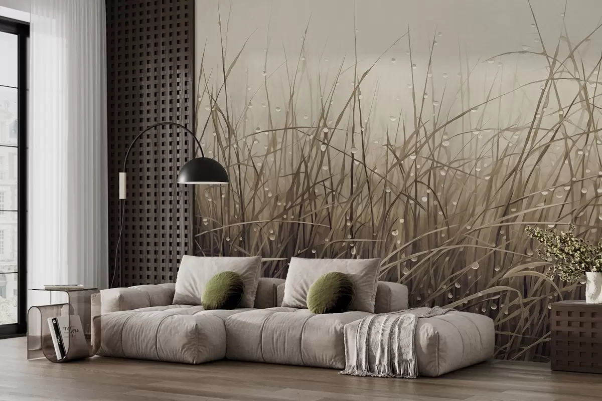 Fototapet Græs med vanddråber, dæmpede brune nuancer, blødt lys, tåget baggrund, abstrakt minimalistisk tekstureret stil Nr. w09217v1