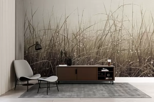 Fototapet Græs med vanddråber, dæmpede brune nuancer, blødt lys, tåget baggrund, abstrakt minimalistisk tekstureret stil Nr. w09217v1
