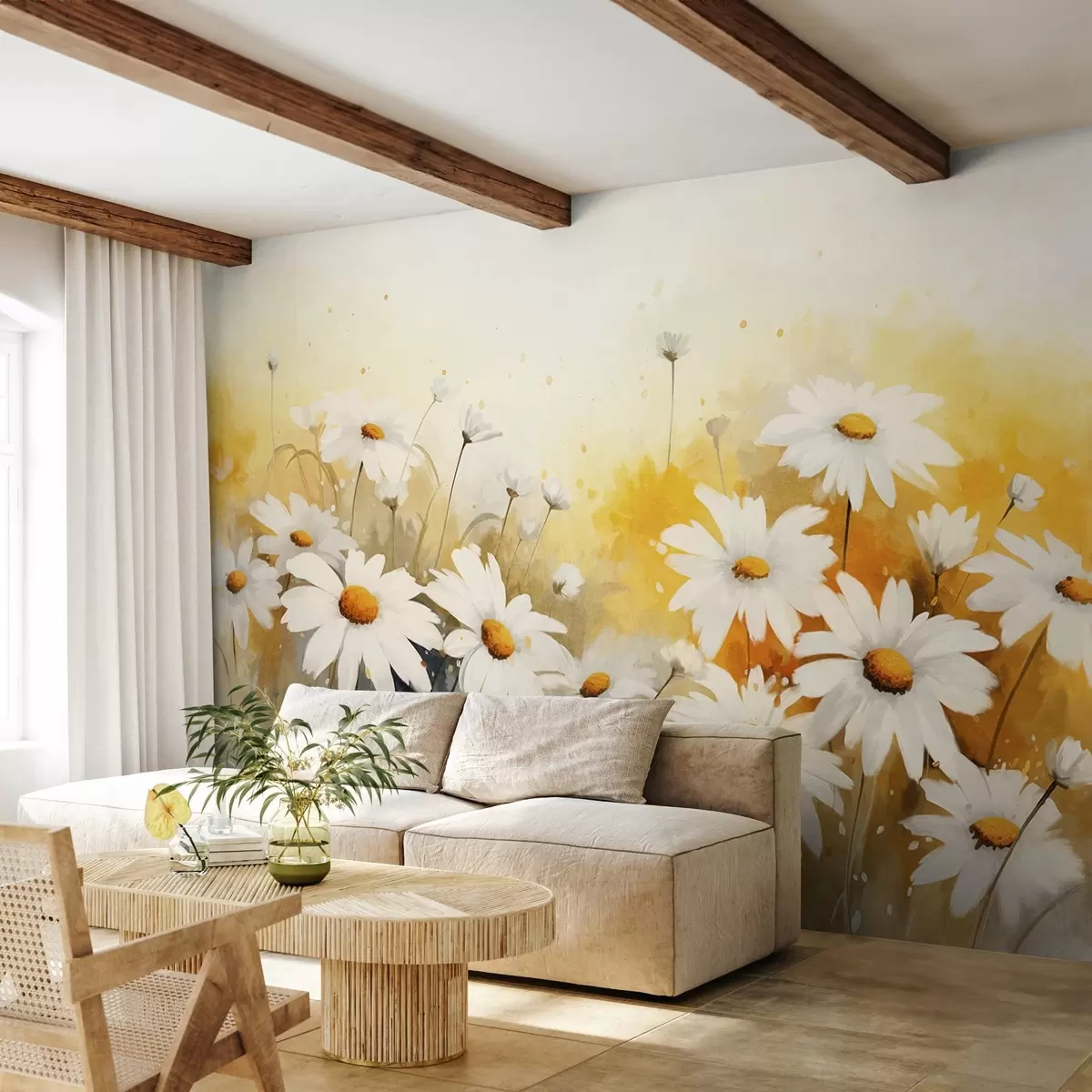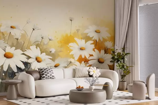 Fototapet Et felt med hvide margueritter med gul midte på en blød gul og beige baggrund, akvarel-stil Nr. w09218