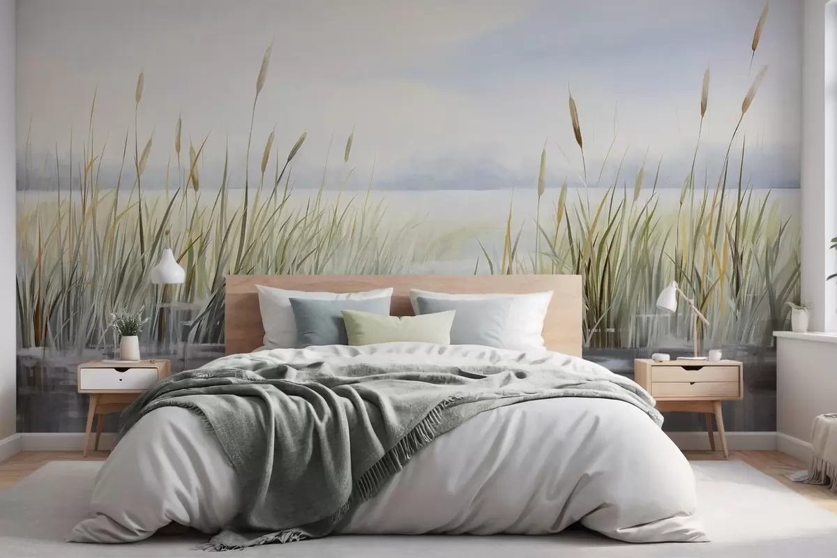 Fototapet Et akvarelmaleri med tekstur, der efterligner et landskab med sø, græs, overskyet himmel og sløret baggrund Nr. w09219