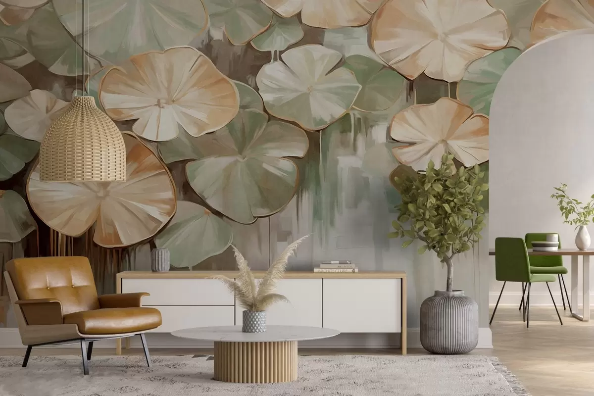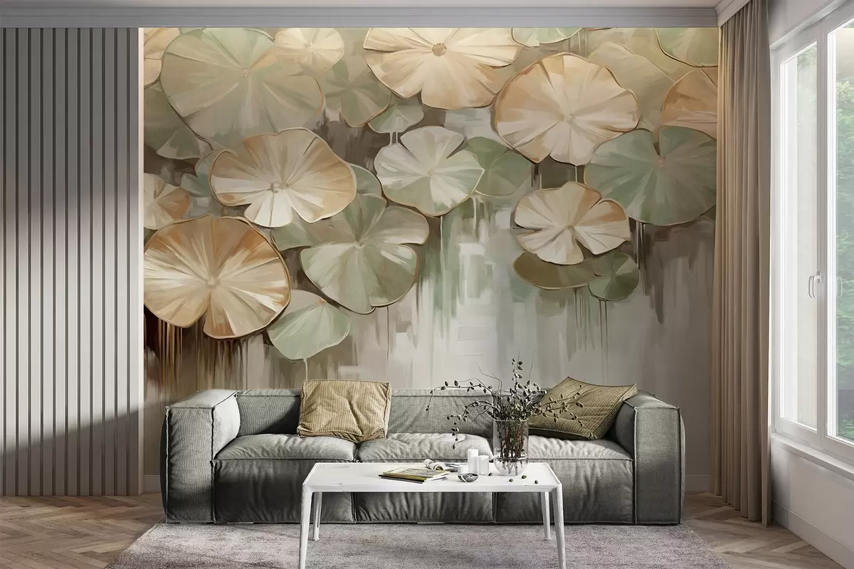 Fototapet Strukturerede åkandeblade med grønne og beige farver i en dam, baggrunden er en sløret blanding af hvid, grøn og brun Nr. w09255