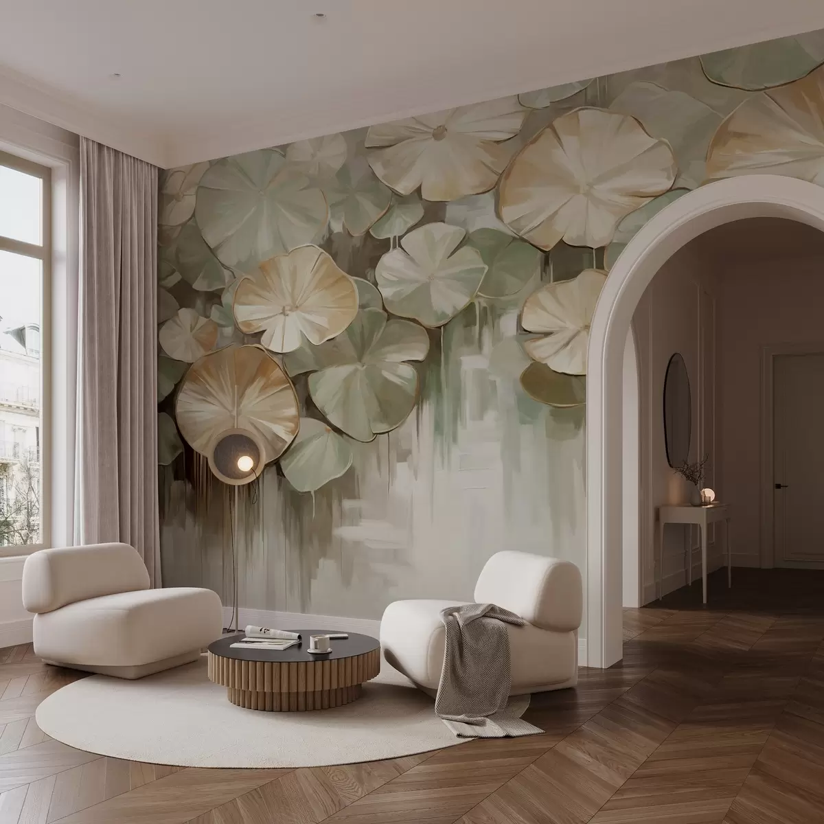 Fototapet Strukturerede åkandeblade med grønne og beige farver i en dam, baggrunden er en sløret blanding af hvid, grøn og brun Nr. w09255