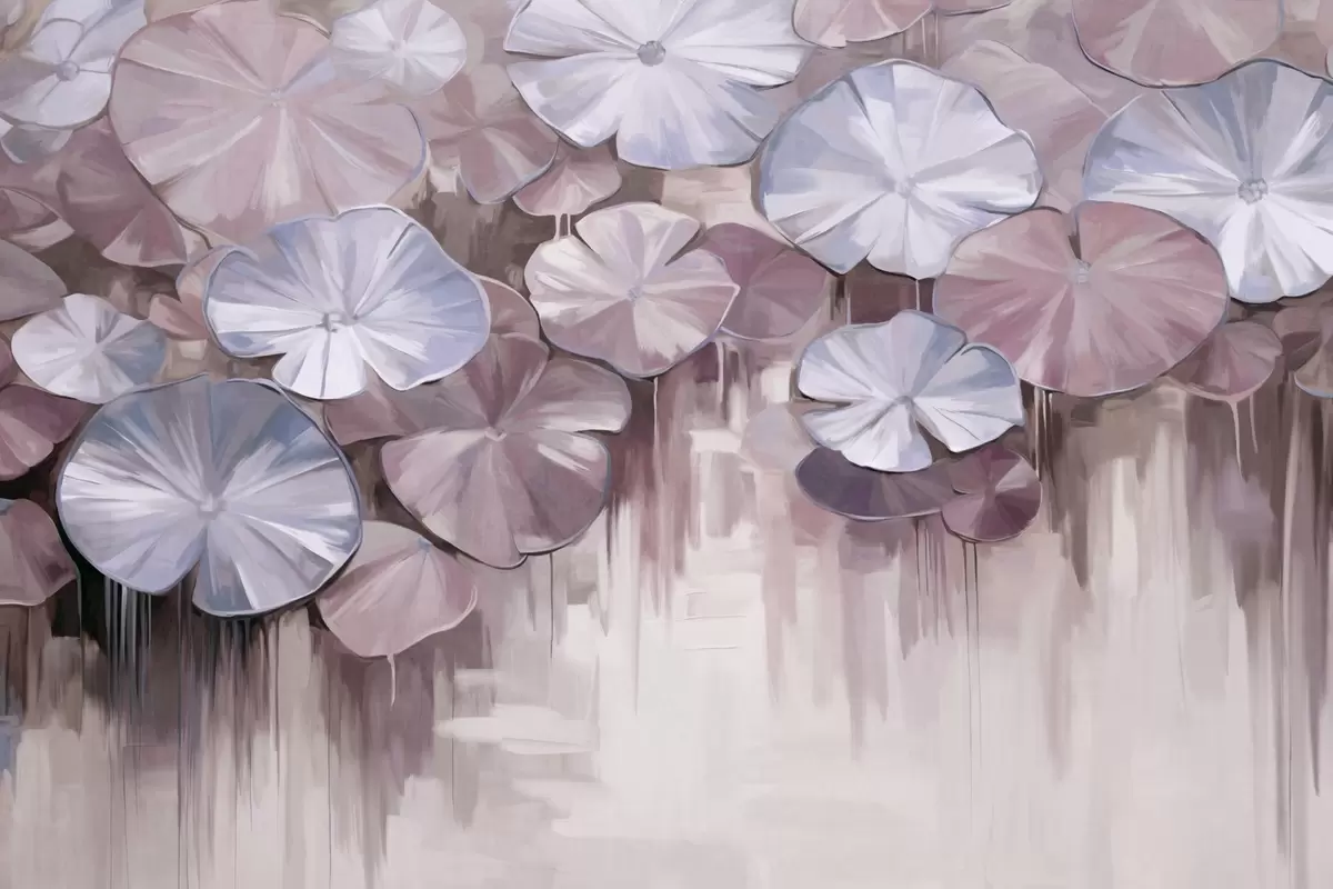 Fototapet Strukturerede åkandeblade med violette og blå farver i en dam, baggrunden er en sløret blanding af bløde nuancer af lilla Nr. w09255v1
