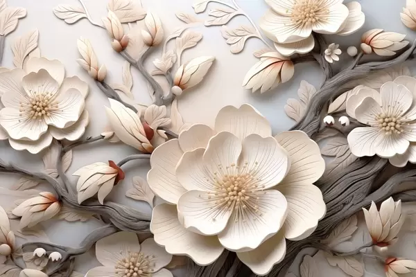 Fototapet Volumetriske blomster og grene i lyse toner Nr. w09272