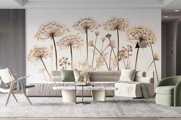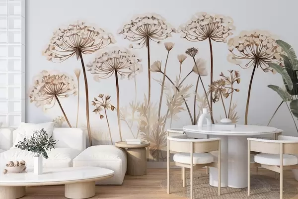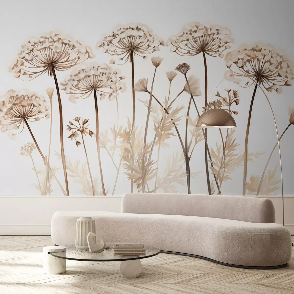 Fototapet Queen Anne's Lace-blomster på en mark, tekstureret maleriimitation, brun, beige og hvid farvepalet, botanisk illustration Nr. w09294