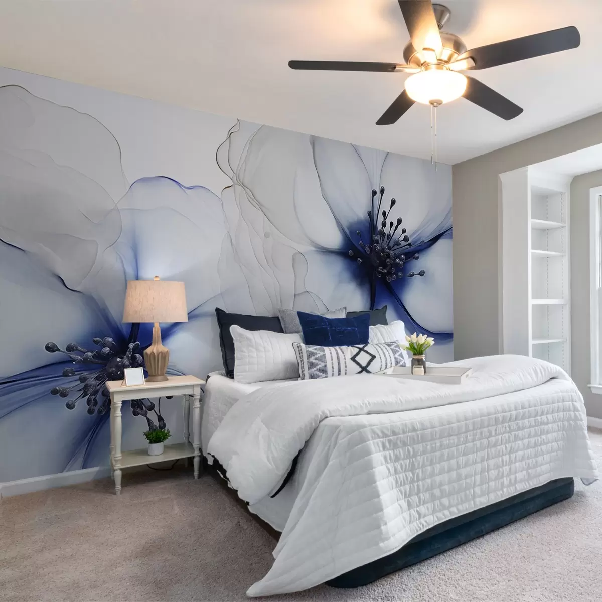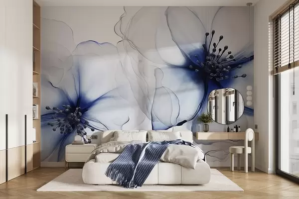 Fototapet To gennemskinnelige blå blomster med synlige støvdragere, overlappende delikate kronblade og en blød, flydende tekstur Nr. w09295v1