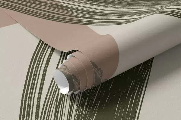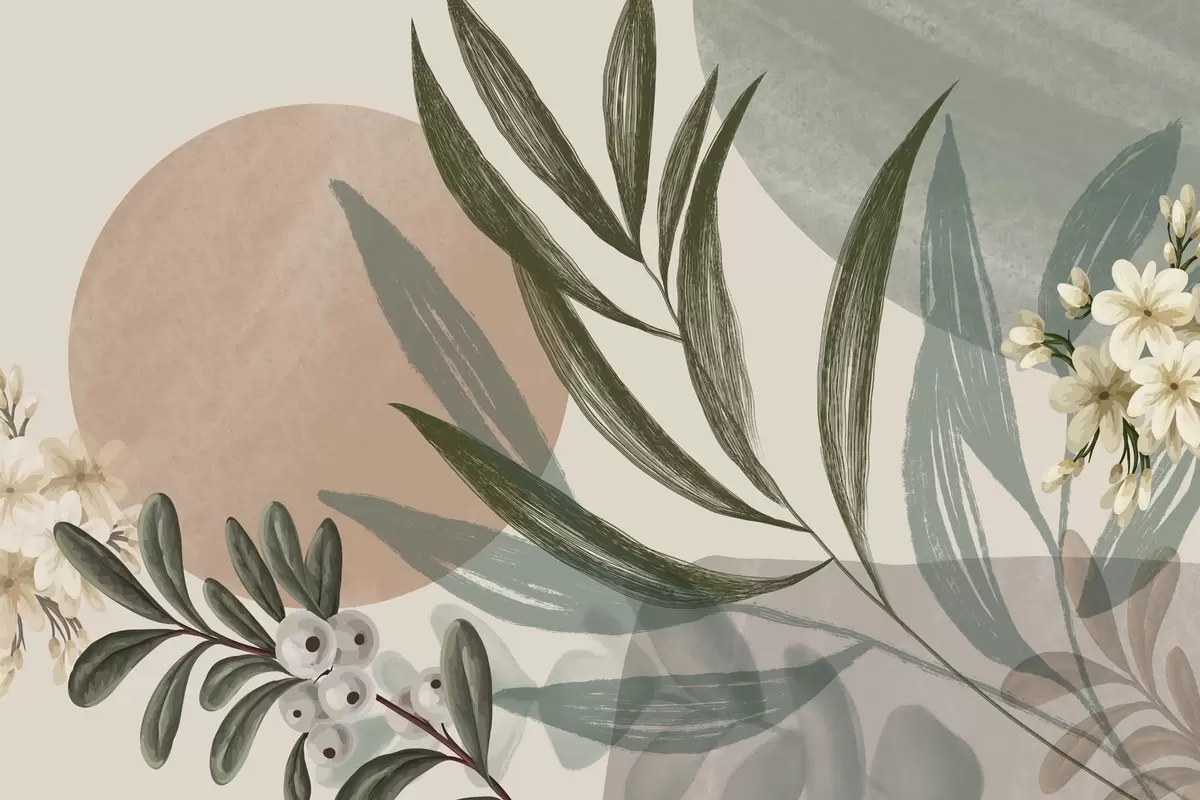 Fototapet Abstrakt botanisk kunst med grønne palmeblade og hvide bær på en baggrund af former i dæmpede jordfarver Nr. w09312