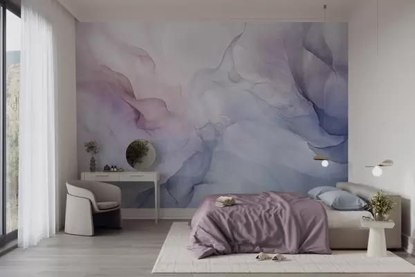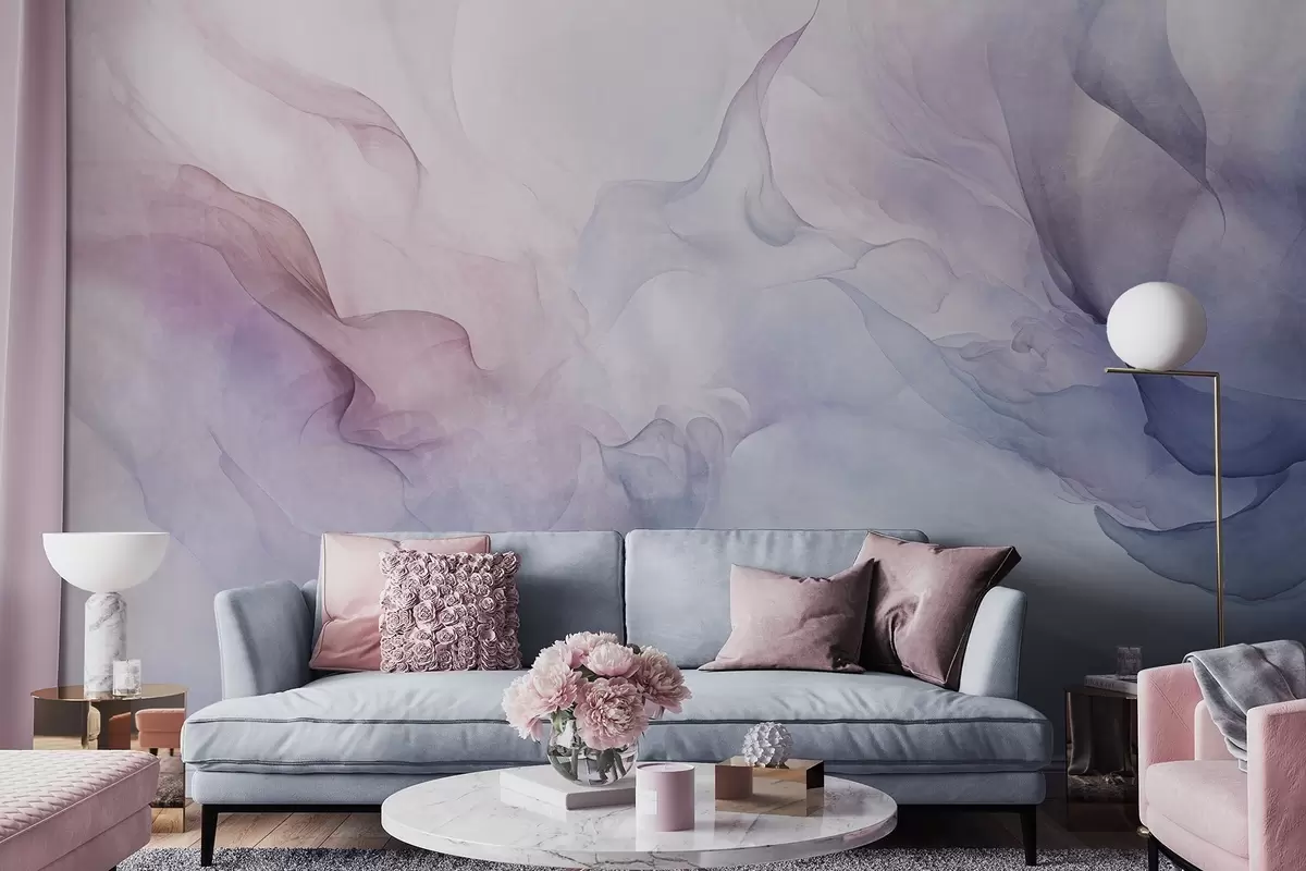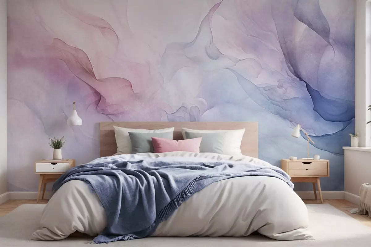 Fototapet Abstrakt tekstureret maleri med flydende pastelfarver i pink, lilla og blå, der skaber en blød effekt Nr. w09318