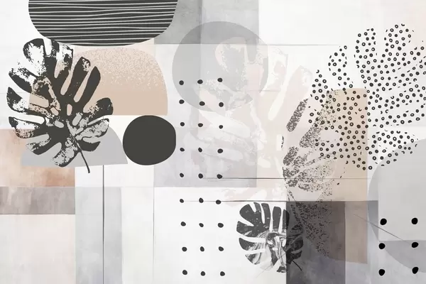 Fototapet Abstrakt print med geometriske former og tropiske monstera-blade, cirkler, prikker og linjer, moderne og minimalistisk design Nr. w09333