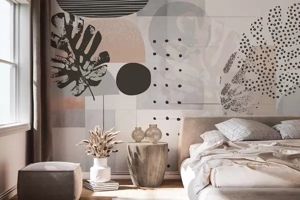 Fototapet Abstrakt print med geometriske former og tropiske monstera-blade, cirkler, prikker og linjer, moderne og minimalistisk design Nr. w09333