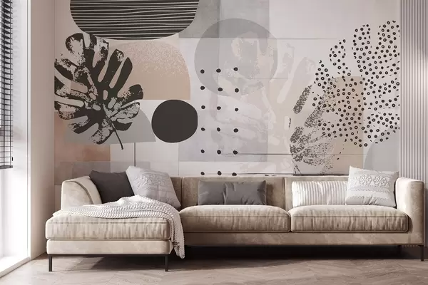 Fototapet Abstrakt print med geometriske former og tropiske monstera-blade, cirkler, prikker og linjer, moderne og minimalistisk design Nr. w09333