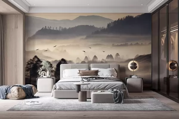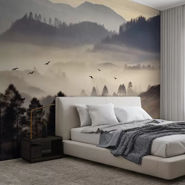 Fototapet Tekstureret bjerglandskab med lag af tåge, træer i silhuet i forgrunden, fjerntliggende bjergkæde, blød belysning Nr. w09338