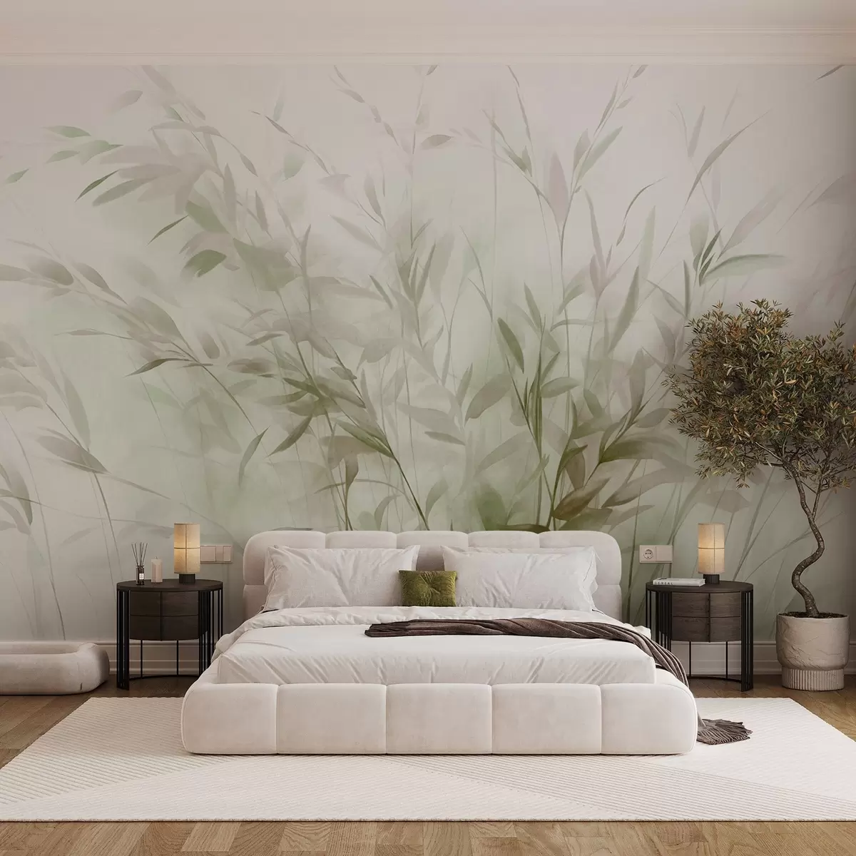 Fototapet Græs og ukrudt med tynde blade og stængler, lysegrønne og brune farver, bløde og delikate penselstrøg, minimalistisk print Nr. w09342