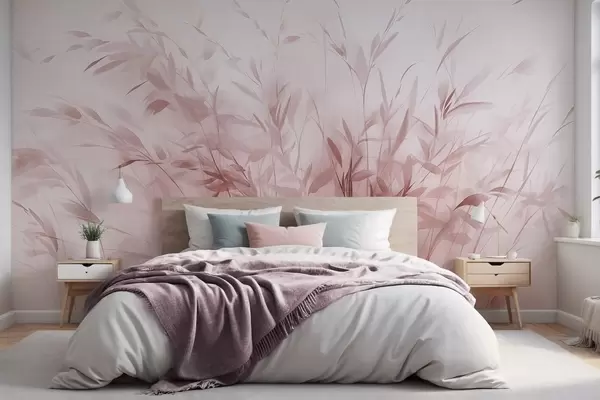 Fototapet Græs og ukrudt med tynde blade og stængler, lyserøde farver, bløde og delikate penselstrøg, minimalistisk print Nr. w09342v2
