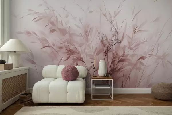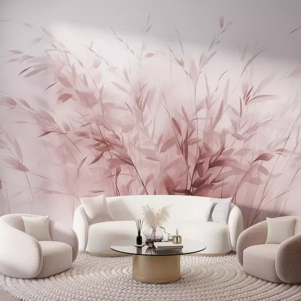 Fototapet Græs og ukrudt med tynde blade og stængler, lyserøde farver, bløde og delikate penselstrøg, minimalistisk print Nr. w09342v2