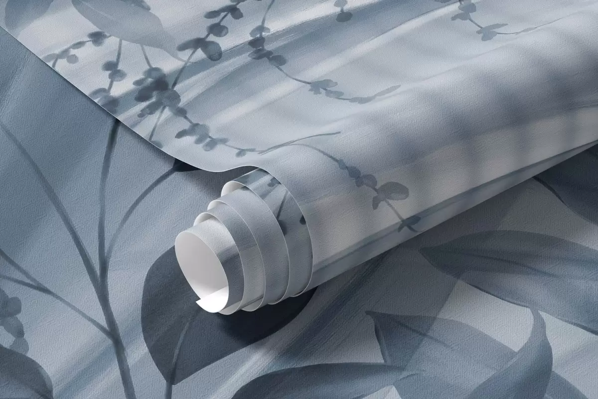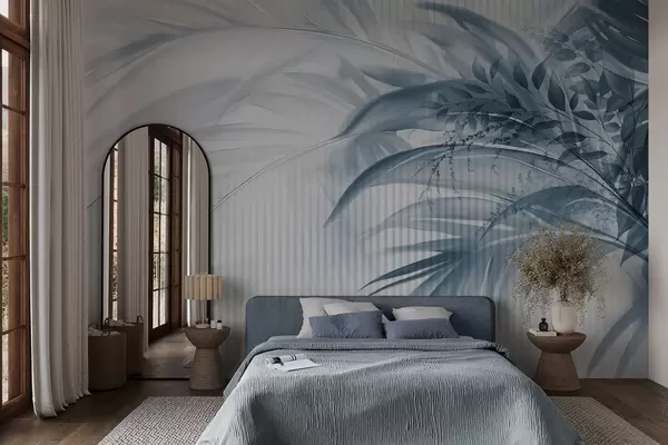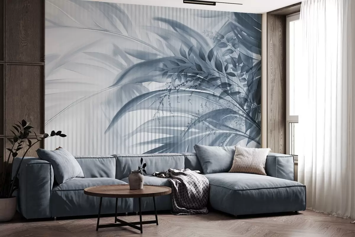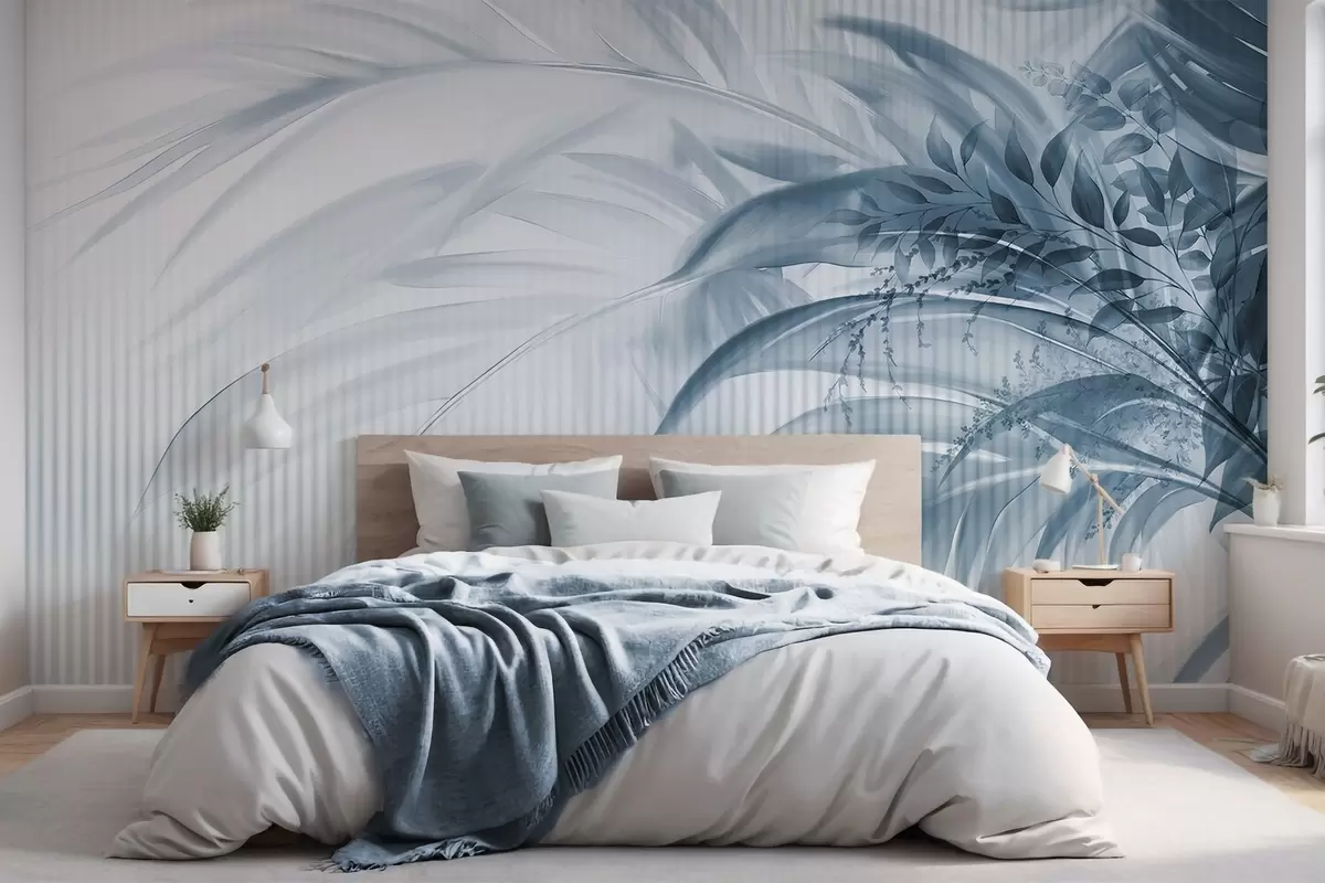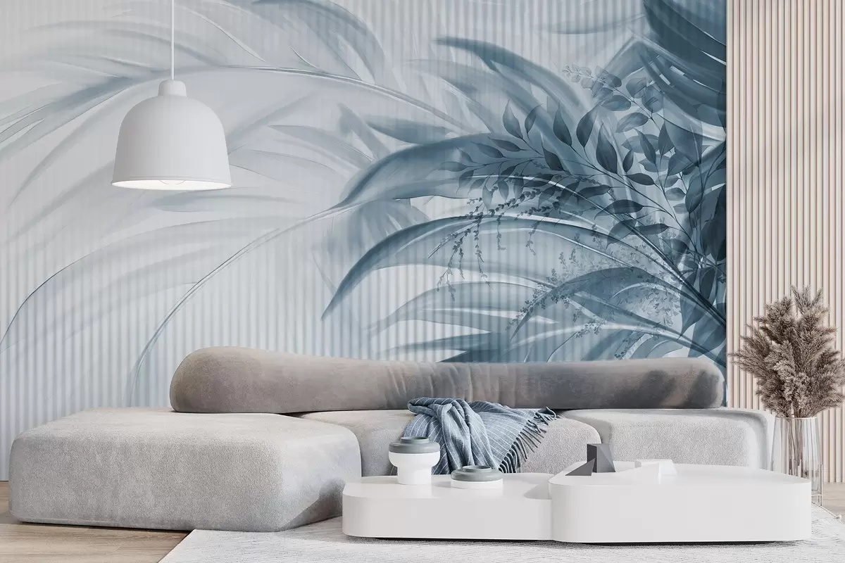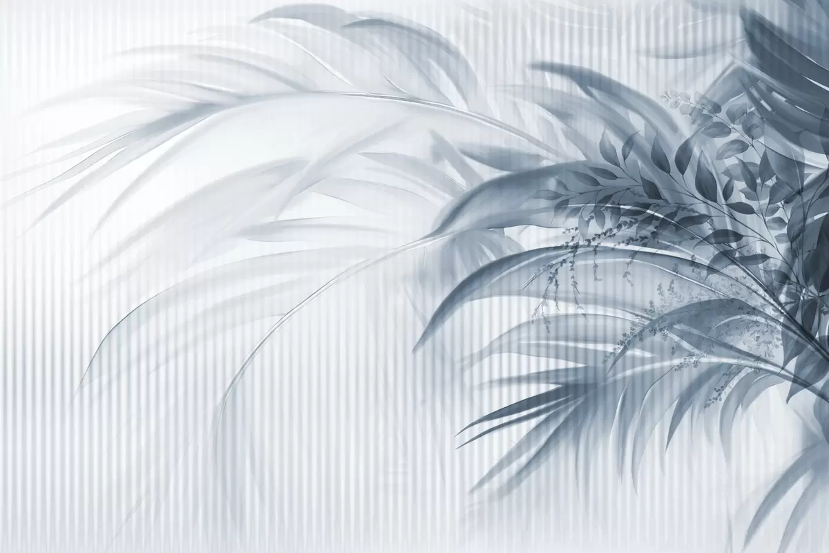 Fototapet Palmetropiske blå blade med hvidstribet baggrund, blød belysning, sarte penselstrøg, organiske former Nr. w09343v1