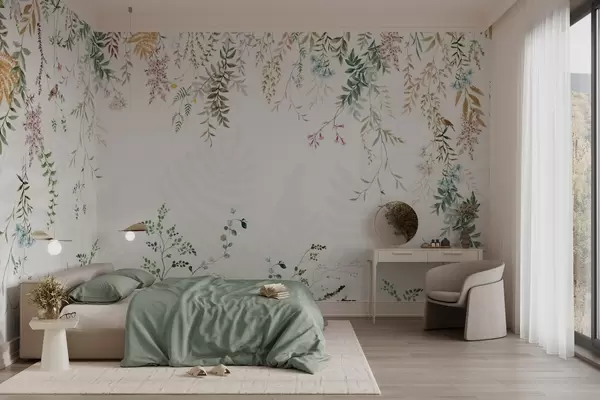 Fototapet Botanisk illustration med bregner, græs og hængende planter, pastelfarver, på hvid baggrund i akvarel-tekstureret stil Nr. w09364