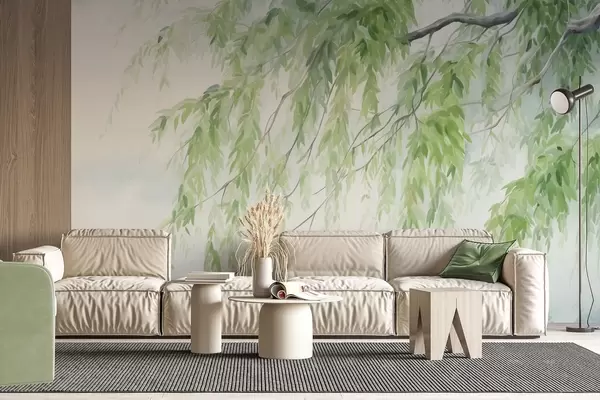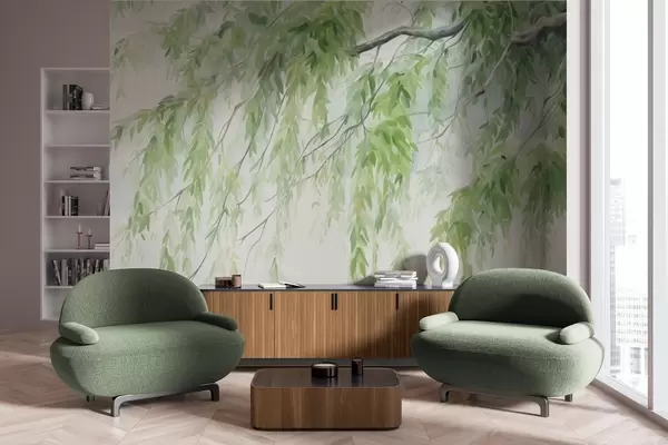 Fototapet Grene af gråpil med grønne blade, der hænger ned, bløde og delikate penselstrøg, akvarelmalet stil Nr. w09365