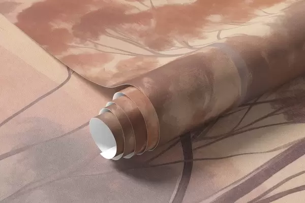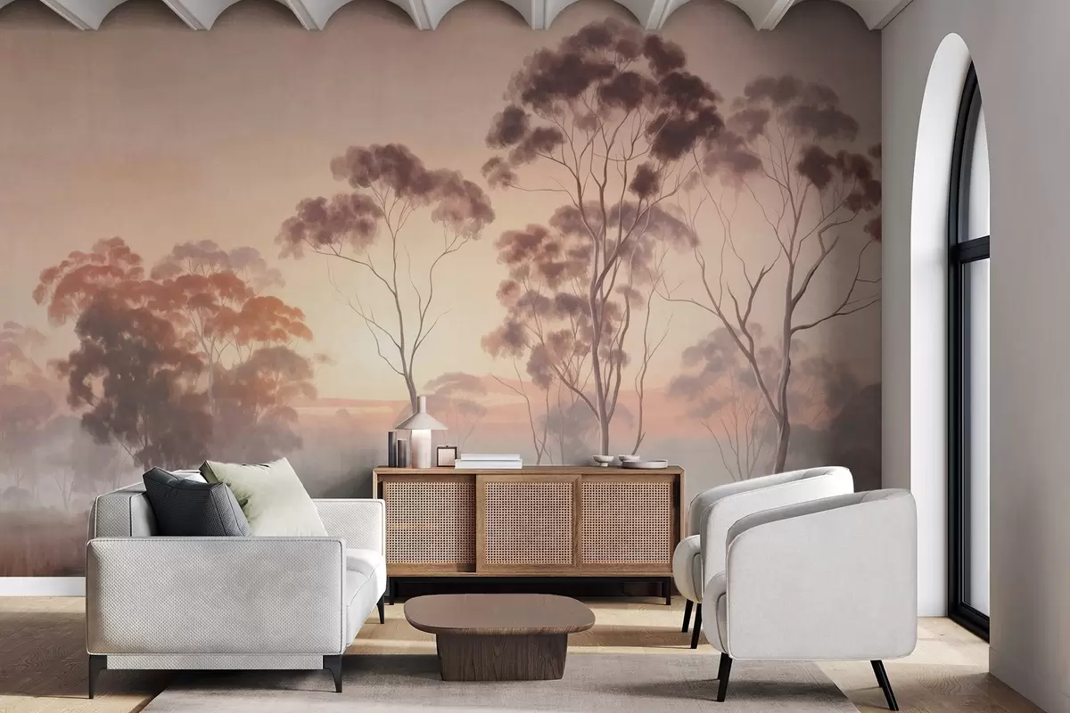 Fototapet Et landskab med eukalyptustræer på en mark med pastelrosa og orange himmel, en let tåge, maleri i tekstureret stil Nr. w09367