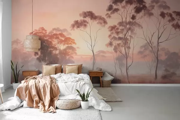 Fototapet Et landskab med eukalyptustræer på en mark med pastelrosa og orange himmel, en let tåge, maleri i tekstureret stil Nr. w09367