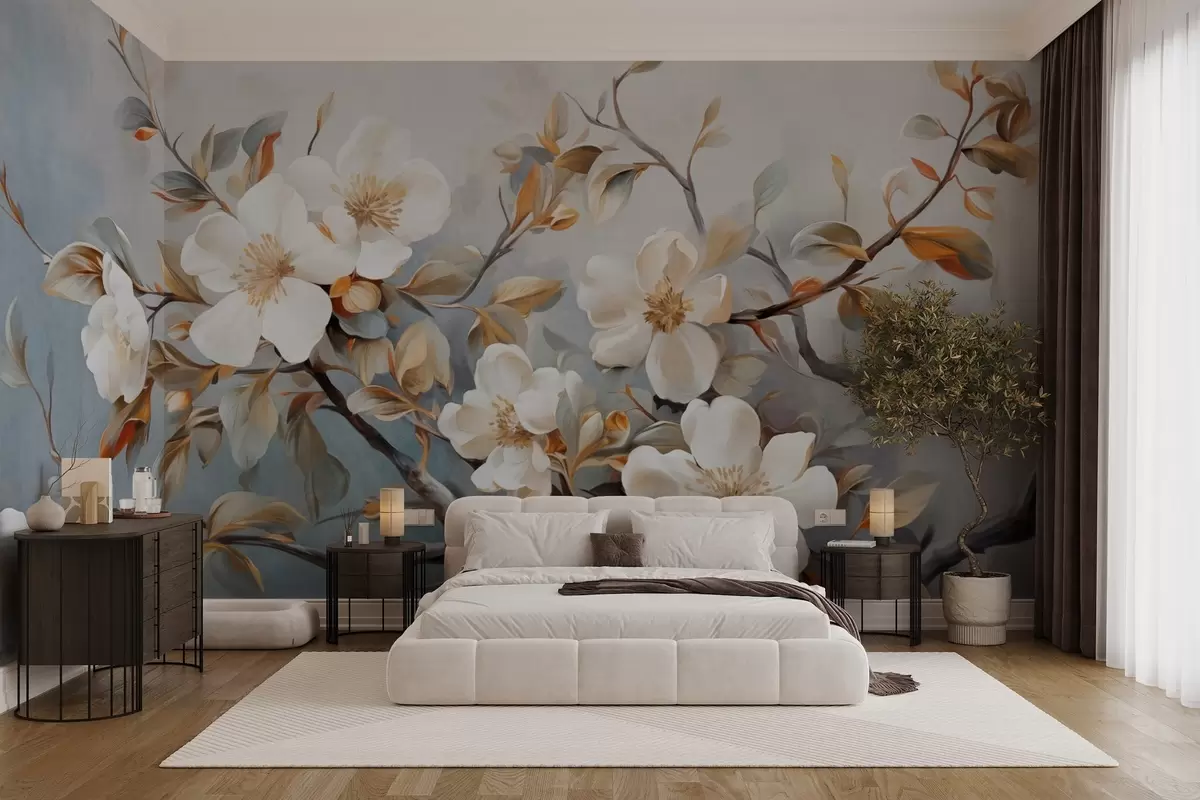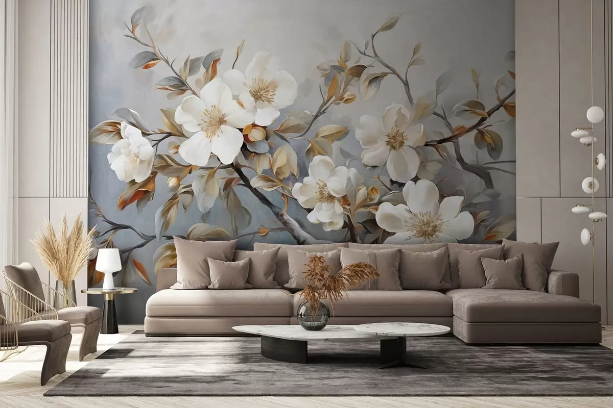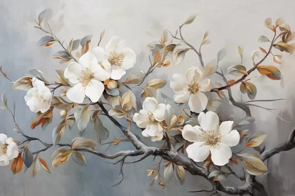 Fototapet Hvide blomster med gule pistiller på en gren med blade, lys baggrund, vintage maleristil, tekstureret print Nr. w09368