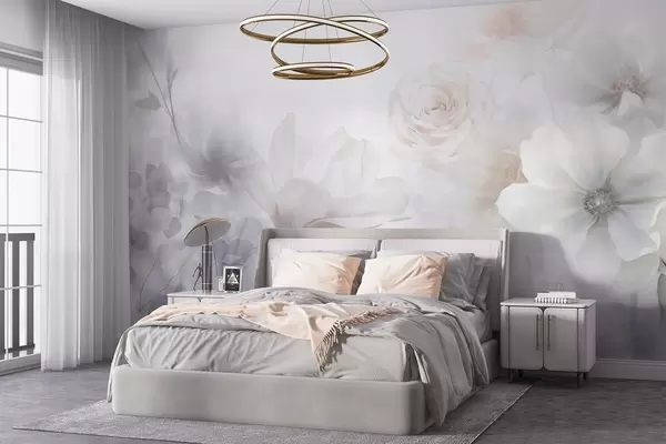 Fototapet Et delikat abstrakt blomsterarrangement med pastelrosa roser og magnolier, blødt fokus, lysegrå baggrund Nr. w09371