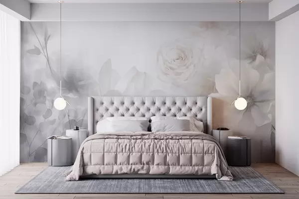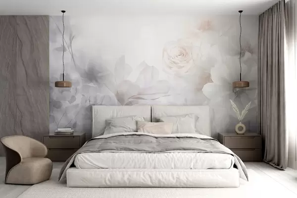 Fototapet Et delikat abstrakt blomsterarrangement med pastelrosa roser og magnolier, blødt fokus, lysegrå baggrund Nr. w09371