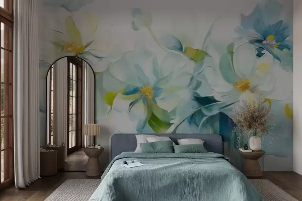 Fototapet Abstrakte hvide og blå blomster med gule pistiller og grønne blade på en hvid baggrund, tekstureret malestil Nr. w09372