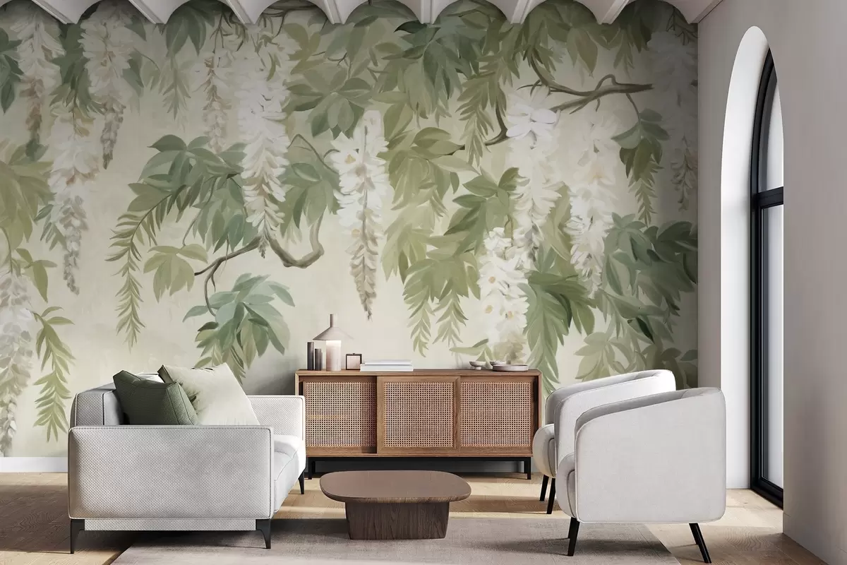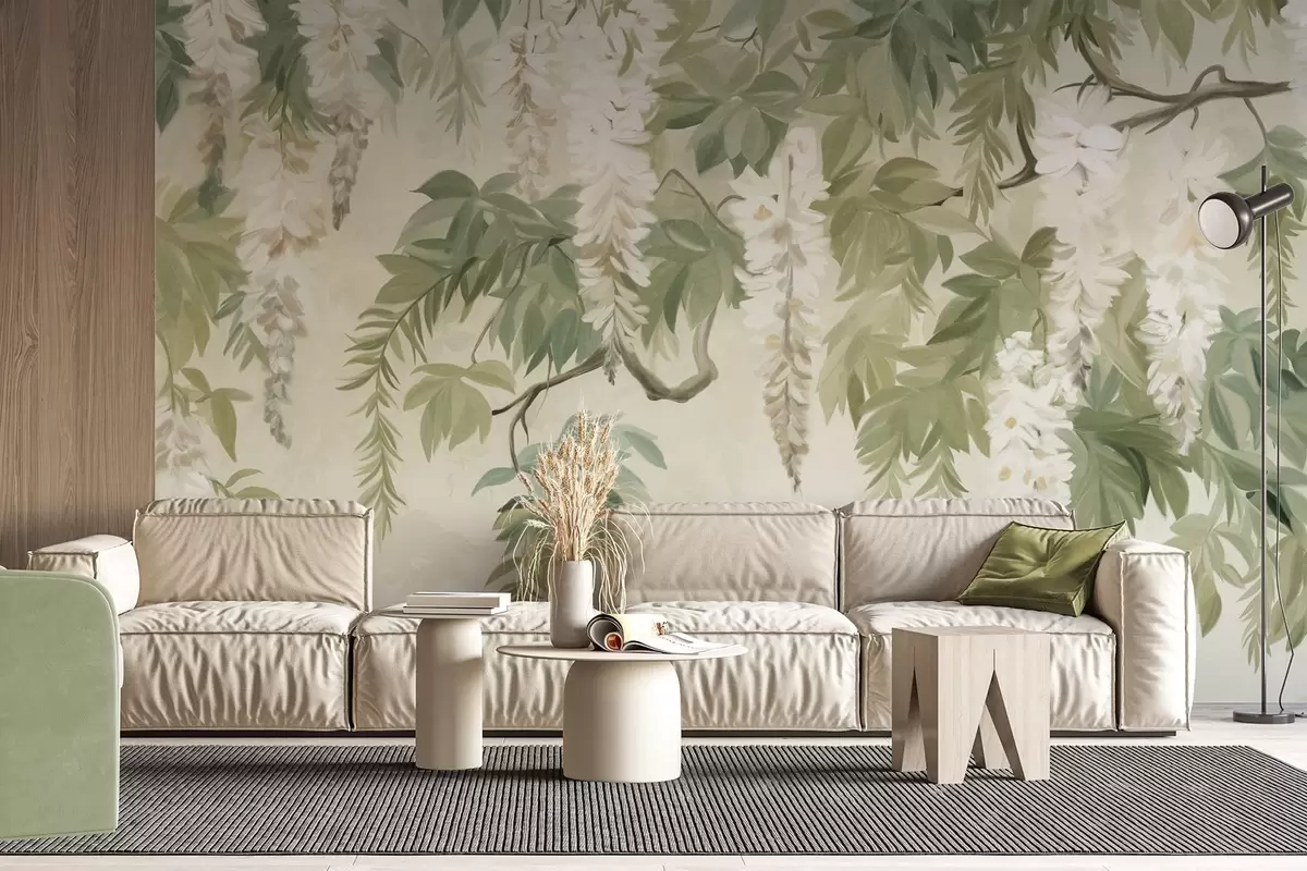 Fototapet Blåregn-grene med hvide blomster og grønne blade, grøn baggrund, tekstureret vintage-maleri Nr. w09375
